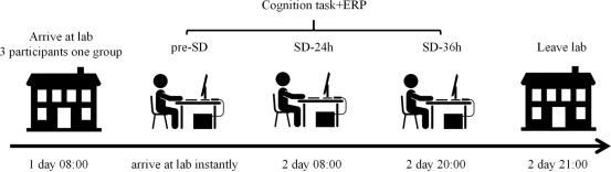 研究团队招募33名作息规律、身心健康的大学生,在实验室中完成36小时连续清醒实验。被试全程禁用咖啡因、酒精及高强度活动,仅可进行轻度认知活动,并由主试监督确保不入睡。实验采用Flanker任务诱发错误:被试需对中央箭头方向快速反应,并在每次按键后立即自评“正确”“错误”或“不确定”,以获取主观错误意识率。测试在三个时间点进行——基线期(pre-SD)、24小时剥夺后(SD-24)和36小时剥夺后(SD-36),用以追踪剥夺效应的时程变化。