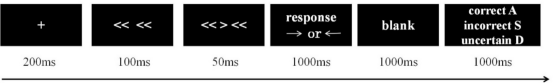 图2 Flanker任务刺激示意图。被试需在每次反应后立即自我评估其回答是否正确(即错误意识):按“A”表示正确,按“S”表示错误,按“D”表示不确定。