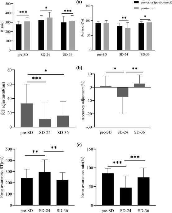 认知神经科学研究表明,有效的错误后调整依赖于两个关键神经过程:早期由错误相关负波(ERN)所反映的自动错误监测,以及晚期由错误正波(Pe)所标志的有意识错误觉察。其中,Pe不仅与主观报告的错误意识高度一致,还直接关联个体能否在犯错后放慢速度(PES)或提升准确率(PIA)。然而,在持续清醒24小时甚至更久的情境下,这些神经-行为机制如何动态演变——是线性衰退,还是存在代偿性恢复?目前尚无清晰答案。