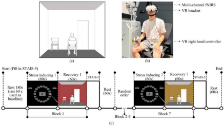 实验流程分为基线休息、压力诱导和色彩恢复三个阶段:先让被试在黑暗虚拟环境中休息180秒(最后60秒为神经生理基线);随后通过计算机化听觉连续加法任务(PASAT-C)诱导急性压力,时长60秒;接着被试随机进入七种色彩墙面的虚拟房间进行60秒压力恢复,期间同步记录fNIRS数据,恢复后填写STAIS-5;每个实验块之间设置60秒黑暗休息以消除残留效应,全程共完成七个实验块。