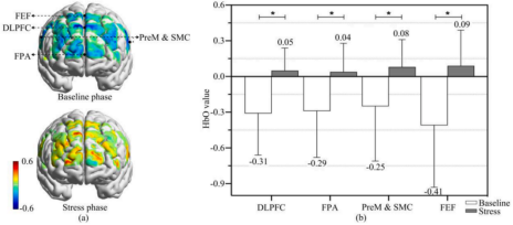 研究发现,PASAT-C任务成功诱发了急性压力,与基线相比,DLPFC、FPA、PreM&SMC、FEF四个感兴趣脑区的HbO浓度均显著升高,且多数被试在至少一个脑区表现出明显的任务相关血流动力学反应,证实压力诱导符合实验预期。