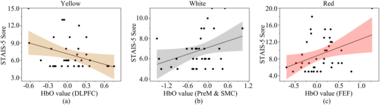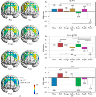 STAIS-5数据显示,红色和紫色墙面的焦虑评分显著高于基线,且红色评分显著高于蓝色、白色等色彩;相关性分析进一步发现,黄色条件下DLPFC激活与焦虑评分呈负相关,红色条件下FEF激活与焦虑评分呈正相关,白色条件下PreM&SMC激活与焦虑评分呈正相关。