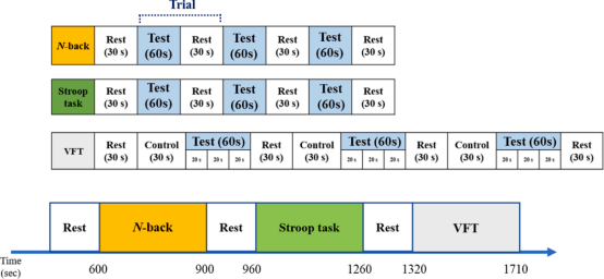 实验包括三项经典认知任务:N-back工作记忆任务、Stroop抑制控制任务以及语义流畅性任务(Verbal Fluency Task, VFT),三项任务均按固定顺序完成。每项任务总时长300秒,由30秒静息期与三个“60秒任务+30秒休息”循环组成。