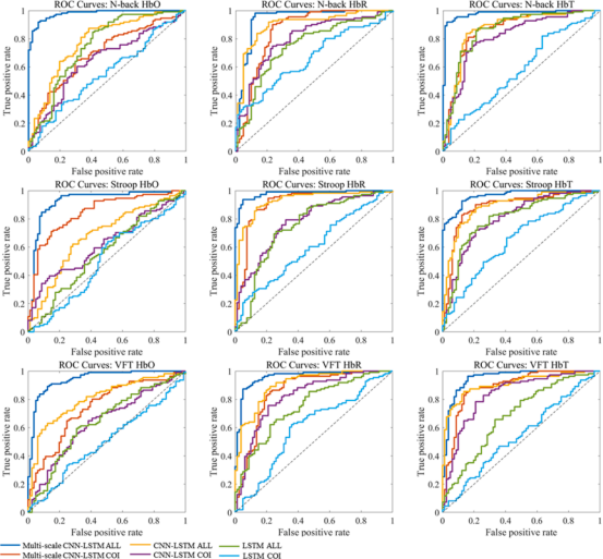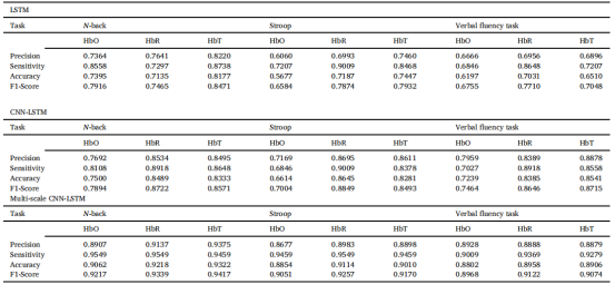 研究结果显示,多尺度CNN-LSTM模型在三类血红蛋白信号(HbO、HbR、HbT)以及三类任务条件下均取得优于传统LSTM和单尺度CNN-LSTM的分类表现。