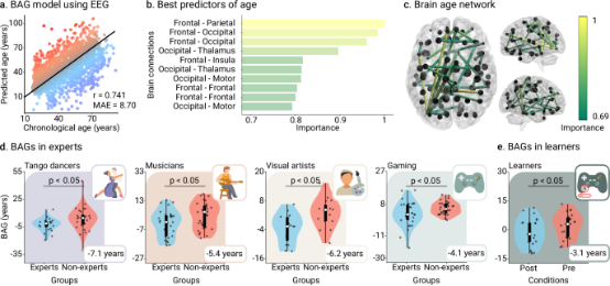 随后,研究在多个创意领域的专业人群中检验创意经验与BAG的关系,包括阿根廷探戈舞者、加拿大音乐家、德国视觉艺术家以及波兰《星际争霸II》专家等群体,所有专家均按年龄、性别、教育程度和地域匹配对应的非专家对照组。此外,为验证短期训练是否也能改变脑年龄指标,研究者还进行了游戏学习实验,让新手在30小时内进行系统的《星际争霸II》训练,并在训练前后采集EEG数据,以检测BAG的变化情况。整个研究通过图论分析、网络效率评估和连接度分析,进一步揭示创意经验可能作用的神经网络机制。