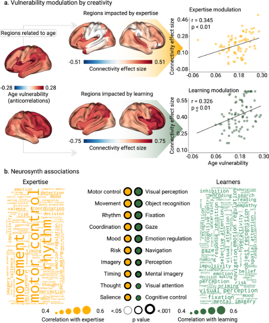 为了进一步理解BAG差异的来源,研究构建了“龄敏感脑图谱”年,用于识别哪些功能连接最受老化影响。随后将专家与对照组的差异映射到该图谱,发现创意经验相关的功能连接增强主要集中在最易受年龄退化影响的脑区,包括前额叶—顶叶网络、额枕连接以及与执行功能、注意控制和多感知整合相关的区域。