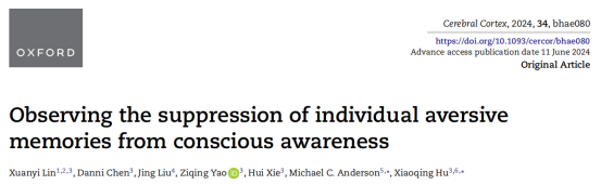 引用:Lin, X., Chen, D., Liu, J., Yao, Z., Xie, H., Anderson, M. C., & Hu, X. (2024). Observing the suppression of individual aversive memories from conscious awareness. Cerebral Cortex, 34(6), bhae080