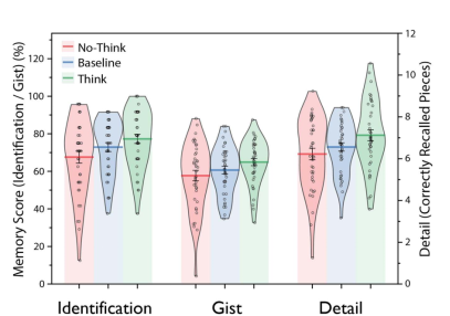 行为学数据显示,经过多次的No-Think操纵,被试对厌恶场景的回忆细节显著少于基线条件,证实了抑制诱发遗忘(Suppression-Induced Forgetting)效应的有效性。