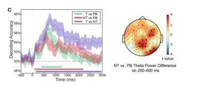 图3 (左)基于时域脑电图的条件水平解码显示三组配对比较均存在显著差异;(右)200-400ms期间,No-Think比基线条件诱发更强的θ波功率