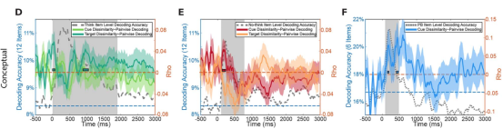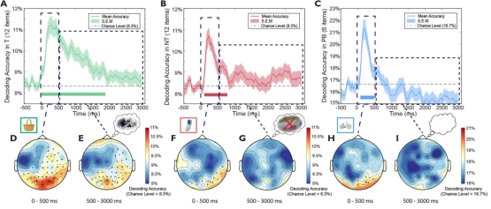 图4 (A-C)各提取条件下的项目水平解码模式;(D-I)早期(0-500ms)和晚期(500-3000ms)时间窗口的时域解码通道搜索光分析