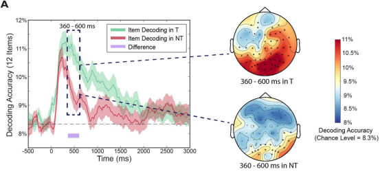 图5 与Think相比,No-Think在360-600ms显著降低项目水平解码准确率