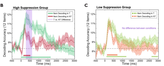 此外,这种早期的神经抑制强度与最终的遗忘效果存在直接的显著相关。通过将被试按遗忘效果分组,分析结果显示,只有成功实现遗忘的“高抑制能力组”,才表现出在早期关键时间窗(280-620 ms)内对记忆表征的显著压制;相比之下,“低抑制能力组”未能在此阶段有效降低记忆的解码准确率。这一结果有力地说明,在记忆提取的早期阶段迅速通过抑制控制“踩下刹车”,是成功阻断痛苦记忆进入意识并导致随后遗忘的关键机制。