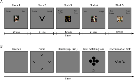 既有关于情绪—认知交互的研究主要依赖面孔、动物等复杂威胁刺激,并一致发现威胁信息能够系统性地改变视觉知觉过程,例如引发物体大小的高估,或降低情境线索对知觉判断的干扰程度。然而,越来越多的证据表明,这类复杂威胁刺激所携带的情绪意义,部分源自其低层次几何结构特征,尤其是尖锐、角形及向下指向的轮廓构型。已有研究表明,向下指向的三角形或V形图案更易被赋予负性情绪价值,并激活与威胁加工相关的神经网络。