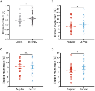 图3 实验1(A)中兼容block与不兼容block的平均反应时(RT),实验2–4(B–D)中,不同启动形状条件下的错觉强度