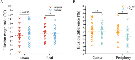 在神经调控实验中,兴奋性刺激右侧DLPFC后,向下指向V形相对于曲线形状所引发的错觉削弱效应完全消失。统计分析显示,启动形状与刺激类型之间存在显著交互作用,表明前额叶调节显著改变了威胁几何形状对视觉大小知觉的影响。