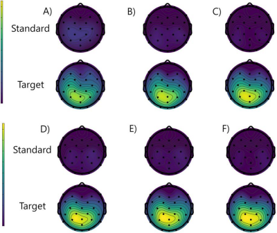 图2 安慰剂组(ABC)与实验组(DEF)在350-550 ms时间窗口内标准刺激与目标刺激诱发的总平均事件相关电位(ERP)地形图(run 1-3)