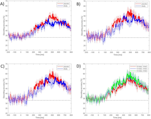 为了捕捉大脑在长时间任务中的动态变化,被试在服用补剂前(Run 1)、服用后30分钟(Run 2)以及服用后90分钟(Run 3)分别完成了一项视觉Oddball任务(一种经典的注意力测试)。研究者采用嵌入32个Ag/AgCl电极的Waveguard™弹性脑电帽(ANT Neuro),基于扩展10/20脑电导联系统记录了这一过程中的脑电信号(EEG),并利用多变量模式分析(MVPA)技术,试图训练一个分类器来区分不同时间段的脑电模式。简而言之,若分类器能有效区分补剂“摄入前”与“摄入后”的脑电模式,就说明大脑状态发生了显著改变。
