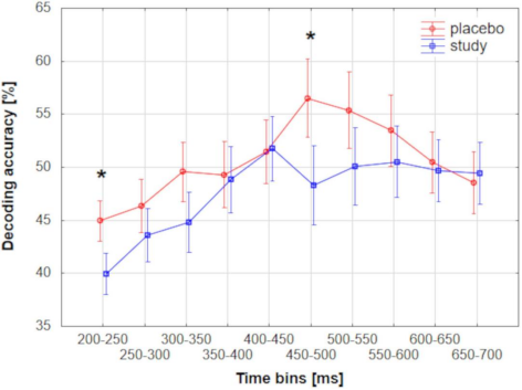 MVPA解码分析进一步细化了这一效应的时间动态——不仅验证了传统ERP发现的晚期效应,更揭示了未被捕捉的早期加工差异。而最关键的发现在于时间窗口:这种解码差异不仅出现在晚期的认知加工阶段(P3成分,约450-500 ms),更令人惊讶地出现在早期的感知处理阶段(P2成分,约200-260 ms)。统计结果表明,在200-250 ms和450-500 ms这两个时间段内,安慰剂组的解码准确率均显著高于研究组。这意味能量膳食补充剂的作用比传统观点认为的要早得多。