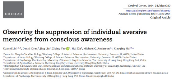 引用:Lin, X., Chen, D., Liu, J., Yao, Z., Xie, H., Anderson, M. C., & Hu, X. (2024). Observing the suppression of individual aversive memories from conscious awareness. Cerebral Cortex, 34(6), bhae080.