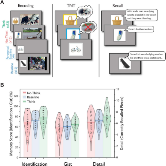 该研究采用情绪版“想/不想”(emotional Think/No-Think, eTNT)范式,招募40名健康大学生参与。实验使用36对“中性物体–厌恶场景”图片配对(如钥匙–车祸、杯子–暴力画面),确保每段记忆具有独特且强烈的负面情绪内容。实验包括编码、eTNT(同步脑电记录)和事后回忆三个阶段:在eTNT阶段,被试根据线索颜色执行“想”(主动回想场景)、“不想”(抑制场景进入意识)或“基线”(仅看新物体)任务。