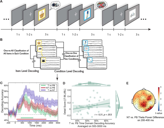 现有研究多依赖fMRI,虽能定位参与抑制的脑区(如前额叶对海马的调控),却难以捕捉抑制过程的毫秒级动态;而传统EEG方法又难以区分单个特定记忆的神经表征。因此,如何在高时间分辨率下“看见”一个具体厌恶记忆被主动压制的过程,仍是领域内的关键挑战。
