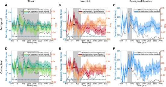 表征相似性分析(RSA)进一步验证,仅在“想”条件下,约1000毫秒后的EEG神经模式与被试主观评定的场景概念相似性显著相关,说明所捕捉到的信号确实反映了记忆内容的恢复,而非对视觉线索的简单感知。