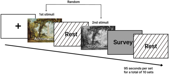 本研究采用被试内设计,招募了31名本科生(21名女性,10名男性,年龄21-29岁)。研究选取了10幅著名的彩色风景画,并通过图像处理技术生成了对应的消色差(灰度)版本,共计20个视觉刺激。