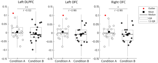fNIRS数据显示,相比于条件B,条件A(灰度→彩色)在展示彩色画作阶段诱发了更强烈的大脑活动。具体表现为左背外侧前额叶皮层(Left DLPFC)以及双侧眶额皮层(Bilateral OFC)的氧合血红蛋白(HbO)浓度显著升高。DLPFC与认知控制和审美评价相关,而OFC则是处理奖赏价值的核心区域。这表明,当色彩在灰度图像铺垫后出现时,大脑调动了更多的神经资源进行深度加工。