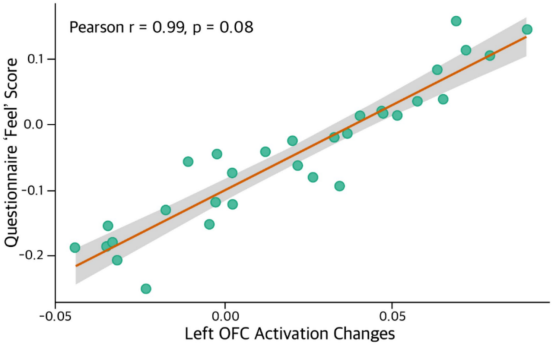 在主观问卷中,被试认为条件A下的画作色彩与内容“匹配度”更高,带来的“感觉”更好。多模态联合分析发现,左眶额皮层(Left OFC)的激活程度与主观的“感觉”评分呈现极强的正相关趋势。值得注意的是,虽然该相关性在经过严格的FDR多重比较校正后呈边缘显著,但这仍强烈提示:我们在欣赏艺术时产生的愉悦感,在神经层面上可能与负责价值编码的眶额皮层活动密切相关。
