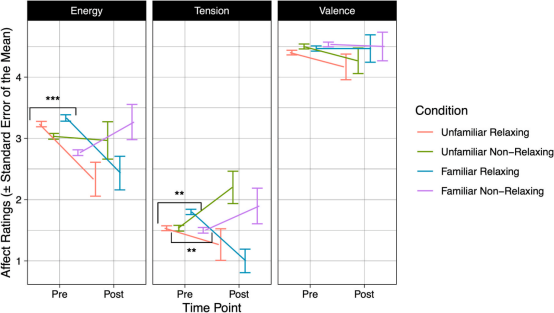 图2 不同聆听条件前后情绪评分(能量、紧张度、效价)的均值