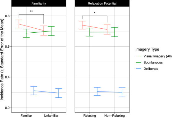 现有研究多采用事后回忆或主观评分的方式评估音乐引发的想象强度,这种方法容易引导参与者进行有意识的、刻意的想象,从而掩盖了更常见、更自然的自发性视觉体验。尽管已有证据表明,视觉想象常伴随大脑后部α波(8–13 Hz)功率的抑制,但这一神经标记是否特异性地反映自发过程,而非一般性的想象活动,尚无直接验证。此外,借鉴“走神”(mind wandering)领域的理论框架,研究者推测自发与刻意想象可能对应不同的神经振荡模式,尤其是δ/θ波段可能参与调控内在注意资源的分配,但这一假设在音乐情境下尚未得到检验。