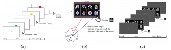 本研究共招募12名健康右利手驾驶员(男性4人,女性8人,年龄20–28岁,平均23.5岁),均持有有效驾照且视力或矫正视力正常。实验在模拟驾驶环境中进行,被试注视右侧一块10.4英寸车载触摸屏,屏幕上随机在四个预设位置之一呈现“导航”图标(目标刺激),其余位置为干扰图标;任务要求被试尽快识别并点击目标图标。