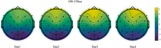 图3 P1成分在100–150 ms时间窗的地形图