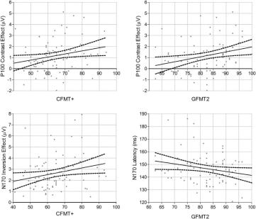 在脑电结果方面,研究成功复现了多个经典ERP效应。高对比棋盘格相较低对比条件诱发显著的P100增强;面孔刺激相较非面孔刺激诱发更大的N170;倒置面孔引起典型的N170潜伏期延迟。这些结果在较大样本和高试次数条件下表现出良好的稳定性。进一步的脑—行为关联分析显示,P100对比效应与GFMT2及CFMT+成绩均呈显著正相关,表明早期视觉加工能力本身即可预测个体在面孔识别任务中的表现。