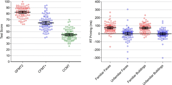 图4 GFMT2、CFMT+与CCMT的平均成绩及个体分布(左),以及反应时启动效应(非重复−重复)的平均值(右)