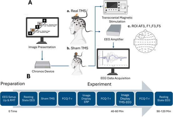 针对这一挑战,研究者在NeuroImage期刊上发表了题为“Cortical dynamics of motivational salience: TMS-EEG and ERP integration in a food cue paradigm”的研究,创新性地结合事件相关TMS-EEG与经典食物线索范式。通过在图片呈现后0ms(早期注意阶段)和300ms(晚期评估阶段)精准施加TMS脉冲扰动左侧DLPFC,并同步记录TMS诱发脑电位(TEPs),首次实现了对高/低食物渴望个体在动机显著性加工过程中前额叶皮层兴奋性与抑制性动态的因果性、时序性刻画,揭示了渴望强度与特定TEP成分之间的直接关联。
