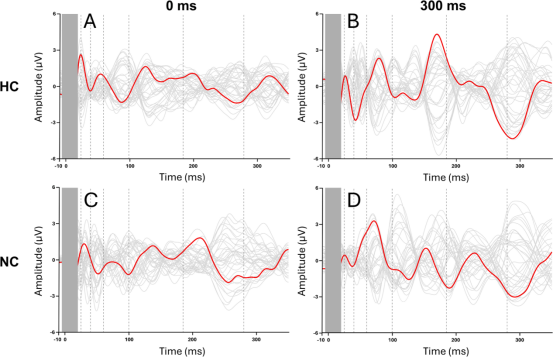 图2 食物线索图片诱发的左侧DLPFC区域平均TMS-诱发电位(TEPs),展示高渴望组(HC)与正常渴望组(NC)在两个时间点施加TMS后的群体平均TEP波形。(A) HC组,TMS施加于图片呈现后 0 ms;(B) HC组,TMS施加于 300 ms;(C) NC组,TMS施加于 0 ms;(D) NC组,TMS施加于 300 ms。