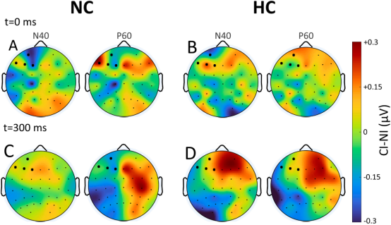 图4 DLPFC区域CI–NI对比的头皮地形图