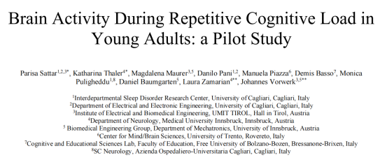 参考文献:Sattar, P., Thaler, K., Maurer, M., Pani, D., Piazza, M., Basso, D., Puligheddu, M., Baumgarten, D., Zamarian, L., & Vorwerk, J. (2025). Brain activity during repetitive cognitive load in young adults: A pilot study. In 2025 47th Annual International Conference of the IEEE Engineering in Medicine and Biology Society (EMBC)(pp. 1–5). IEEE. https://doi.org/10.1109/EMBC58623.2025.1125445