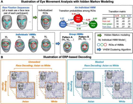 首先,在社会分类任务中,被试判断面孔属于Asian还是White类别。刺激包含本族面孔、他族面孔以及50%混合种族morphed面孔,且均设置戴口罩(masked)与不戴口罩(unmasked)条件。记录分类准确率、反应时以及对混合种族面孔的本族分类偏向。随后,被试在同步记录脑电与眼动的条件下完成身份one-back任务,仅需判断连续呈现的两张面孔是否属于同一身份,而不进行任何显性社会分类判断,从而在自由观看条件下诱发稳定的面孔加工过程。面孔刺激在种族与口罩状态之间进行平衡操纵。眼动数据采用基于隐马尔可夫模型(Hidden Markov Model, HMM)的眼动分析方法,用于建模个体视觉扫描模式及注视一致性(以熵值表示)。