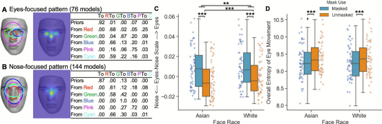 图4 身份one-back任务中自由观看的(A)眼区聚焦模式与(B)鼻区聚焦模式,(C)显示口罩条件与面孔种族对眼–鼻量表的影响,(D)显示其对整体眼动熵的影响