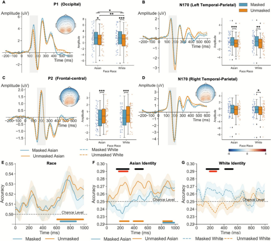 ERP结果表明,口罩对多个加工阶段产生影响。P1成分中原本存在的种族差异在戴口罩条件下减弱或消失,表明口罩调节了早期视觉注意分配。N170在戴口罩条件下振幅减小,提示面孔结构编码受到限制。P2成分亦表现出口罩调节效应。然而,在多变量解码分析中,种族信息在戴口罩与不戴口罩条件下均可被成功解码,且解码准确率无显著差异,说明种族神经表征具有较强稳定性。相比之下,身份解码受到口罩调节,并在不同种族面孔上呈现差异性变化。