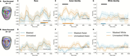 此外,个体差异分析显示,视觉扫描偏向眼区的个体在戴口罩条件下仍能稳定解码种族信息,而鼻区偏向个体则表现较弱,提示视觉策略在维持种族神经表征方面具有关键作用。