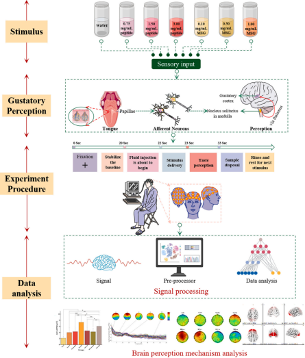尽管鲜味肽与MSG在外周受体层面可能共享部分信号传导通路,但其在中枢神经系统中的加工机制是否一致,目前仍缺乏系统性的实证证据。现有研究多侧重于主观感官评价或功能影像所揭示的区域激活差异,对于味觉加工的时间动态特征关注相对不足。尤其是在主观鲜味强度严格匹配的前提下,鲜味肽与MSG是否呈现相似的神经振荡模式及神经编码特征,尚缺乏直接的对比证据。鉴于脑电图(EEG)具备毫秒级时间分辨率优势,能够有效刻画神经振荡活动及其时空动态变化,本研究在鲜味强度匹配框架下,系统比较两类鲜味刺激所引发的大脑振荡特征及其空间分布模式,旨在揭示不同来源鲜味刺激在中枢神经层面的加工差异,并为鲜味感知神经编码模型提供更具时间维度精度的实证支持。