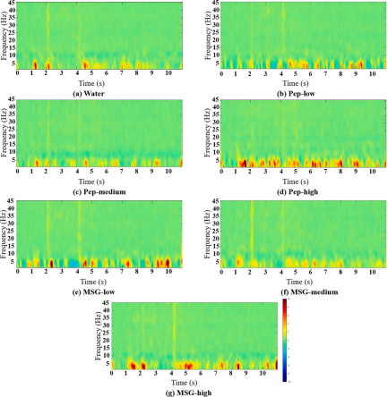 频段分析结果进一步表明,δ(1–4 Hz)与θ(4–8 Hz)频段在鲜味刺激条件下呈现显著增强,是两类刺激共同表现出的主要振荡特征。α(8–13 Hz)频段方面,鲜味肽在低至中等浓度条件下即表现出显著增强,而MSG的α增强主要出现在中等浓度水平。时频分析显示,MSG在刺激后早期时间窗内出现明显的低频振荡增强;相比之下,鲜味肽在后续时间阶段呈现出向β(13–30 Hz)及γ(30–45 Hz)频段扩展的趋势。