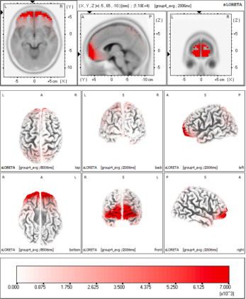 时间域头皮拓扑分析结果显示,刺激后150–350 ms为神经活动增强的主要时间窗口,其中250–350 ms阶段的电位变化最为显著。空间分布方面,鲜味肽在该时间段内表现出相对集中的前额叶区域激活,而MSG则呈现更为广泛的中央及顶叶区域分布。源定位分析结果进一步显示,额叶多个皮层区域在鲜味信息加工过程中均表现出显著激活,其中下额回在两类刺激条件下均呈现稳定激活。