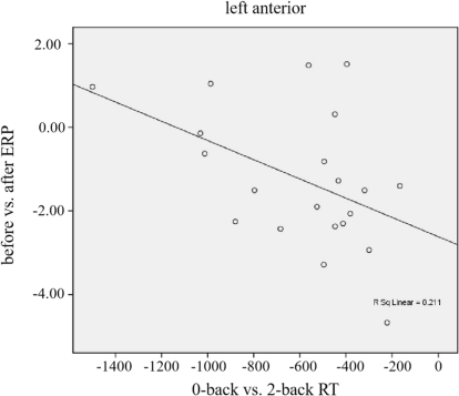 图3 音乐训练组在左前部兴趣区中,N-back任务反应时差异(0-backvs.2-back)与ERP振幅差异(之前vs.之后)之间的相关关系