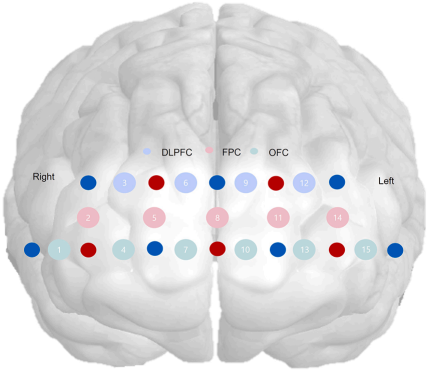 图1 fNIRS设备(NIRSIT LITE)的通道位置分布。红色和蓝色圆圈分别代表光源和探测器。