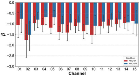 图4 ANC开启(红色)与ANC关闭(蓝色)条件下各通道的回归系数β值