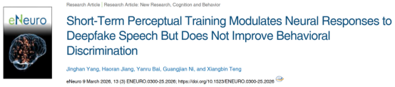 Citation:Yang, J., Jiang, H., Bai, Y., Ni, G., & Teng, X. (2026). Short-term perceptual training modulates neural responses to deepfake speech but does not improve behavioral discrimination. eNeuro, 13(3), ENEURO.0300-25.2026.